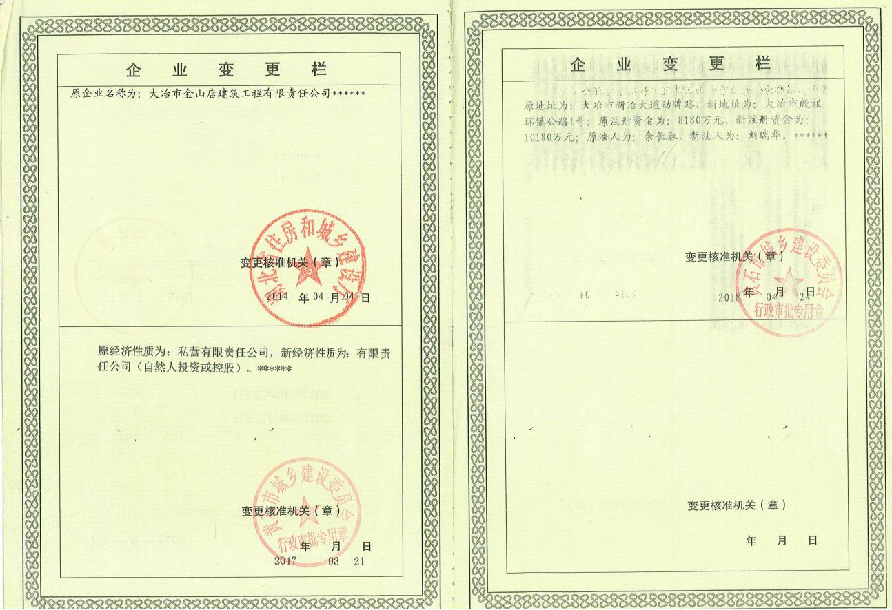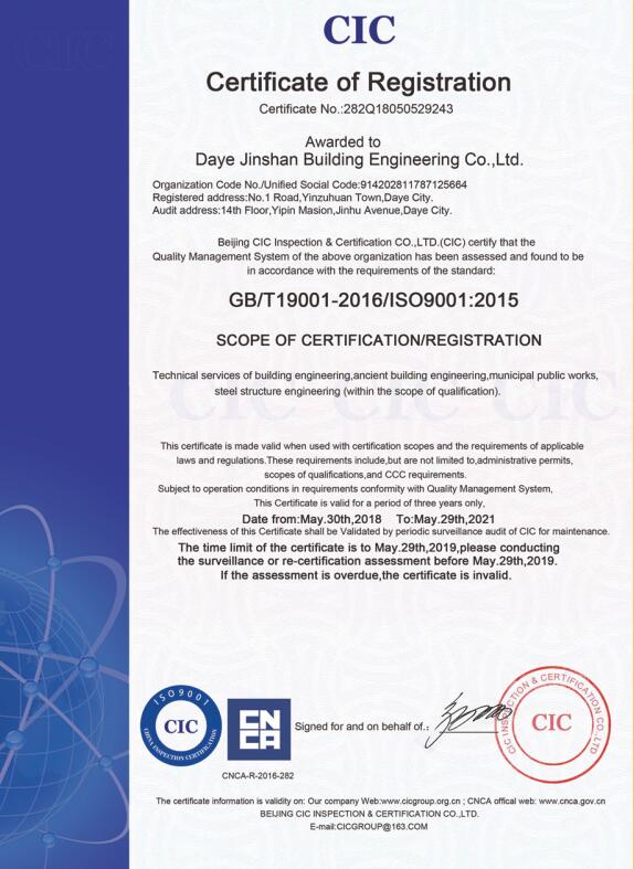 大冶金山建筑工程有限公司始建于1984年,屬鎮(zhèn)辦集體企業(yè)。1997年改制為大冶山建筑工程有限責(zé)任公司,屬股份制企業(yè)。2013年更名為大冶金山建筑工程有限公司,2018年3月公司資源重組,公司注冊(cè)資金達(dá)到10180.00萬(wàn)元,公司法定代表人為劉瑞華。公司具有古建筑工程專業(yè)承包壹級(jí)、建筑工程施工總承包貳級(jí)、市政工程總承包叁級(jí)、鋼結(jié)構(gòu)工程專業(yè)承包叁級(jí)資質(zhì)。